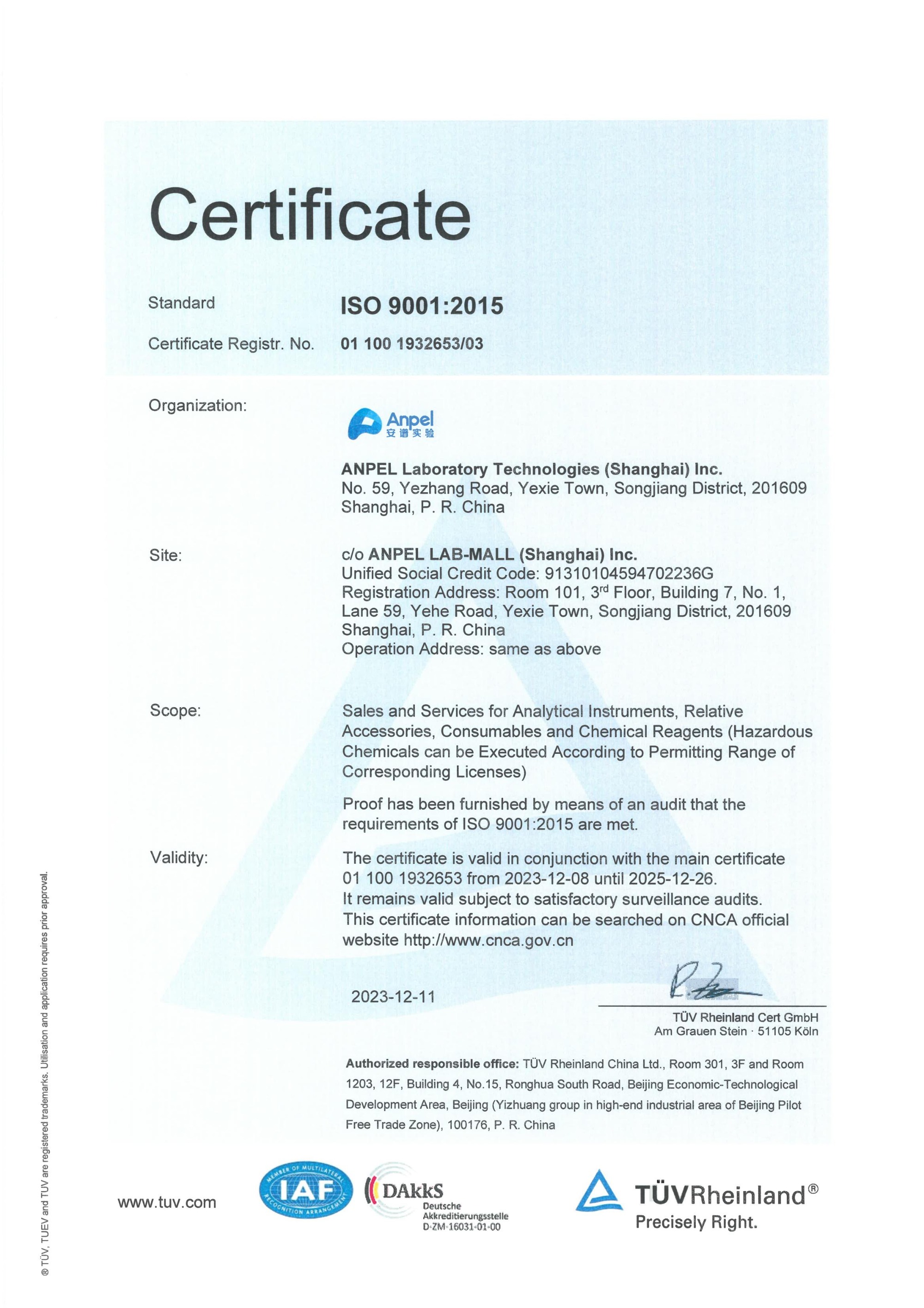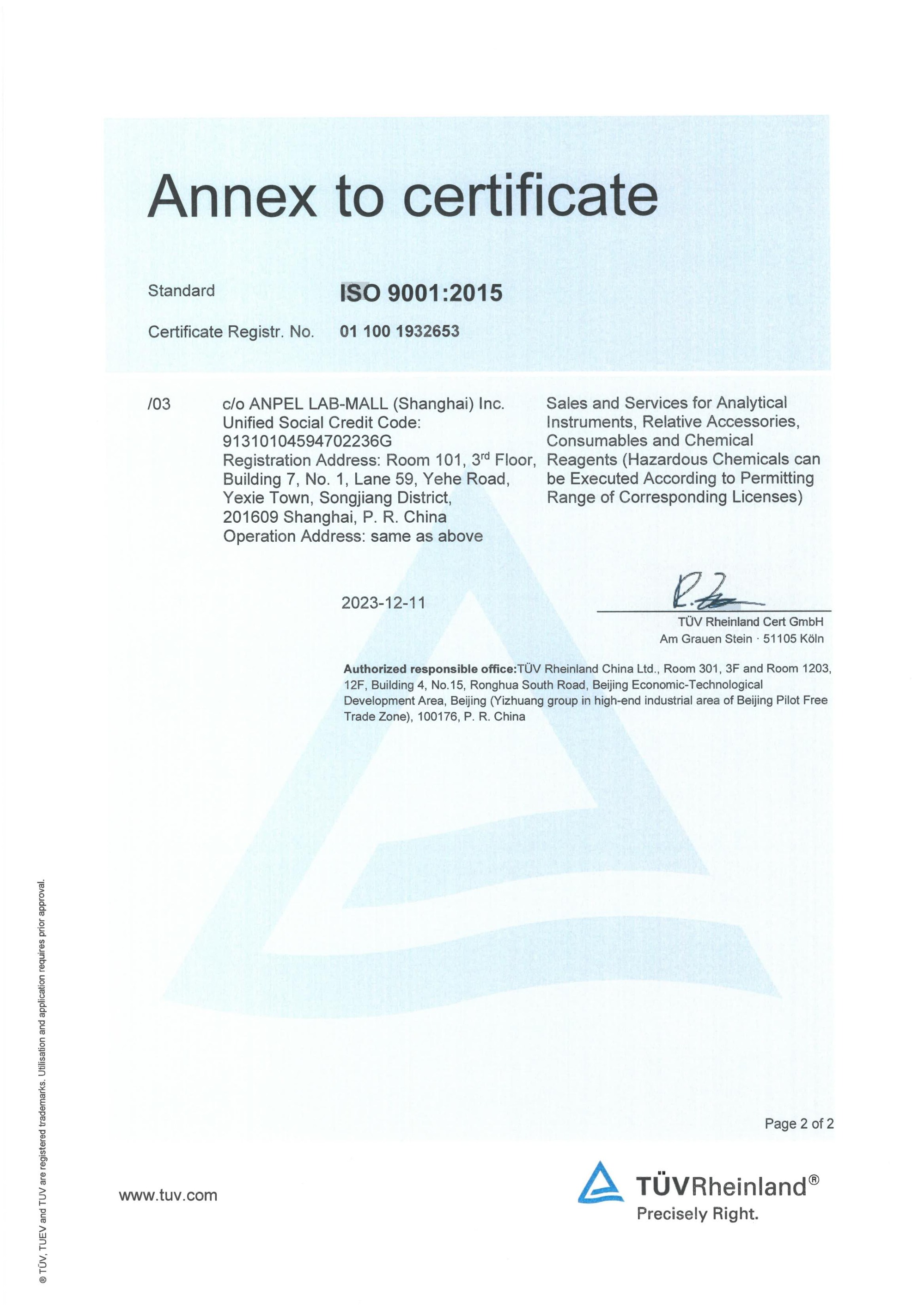 ANPEL LAB-MALL ISO9001 Certificate
