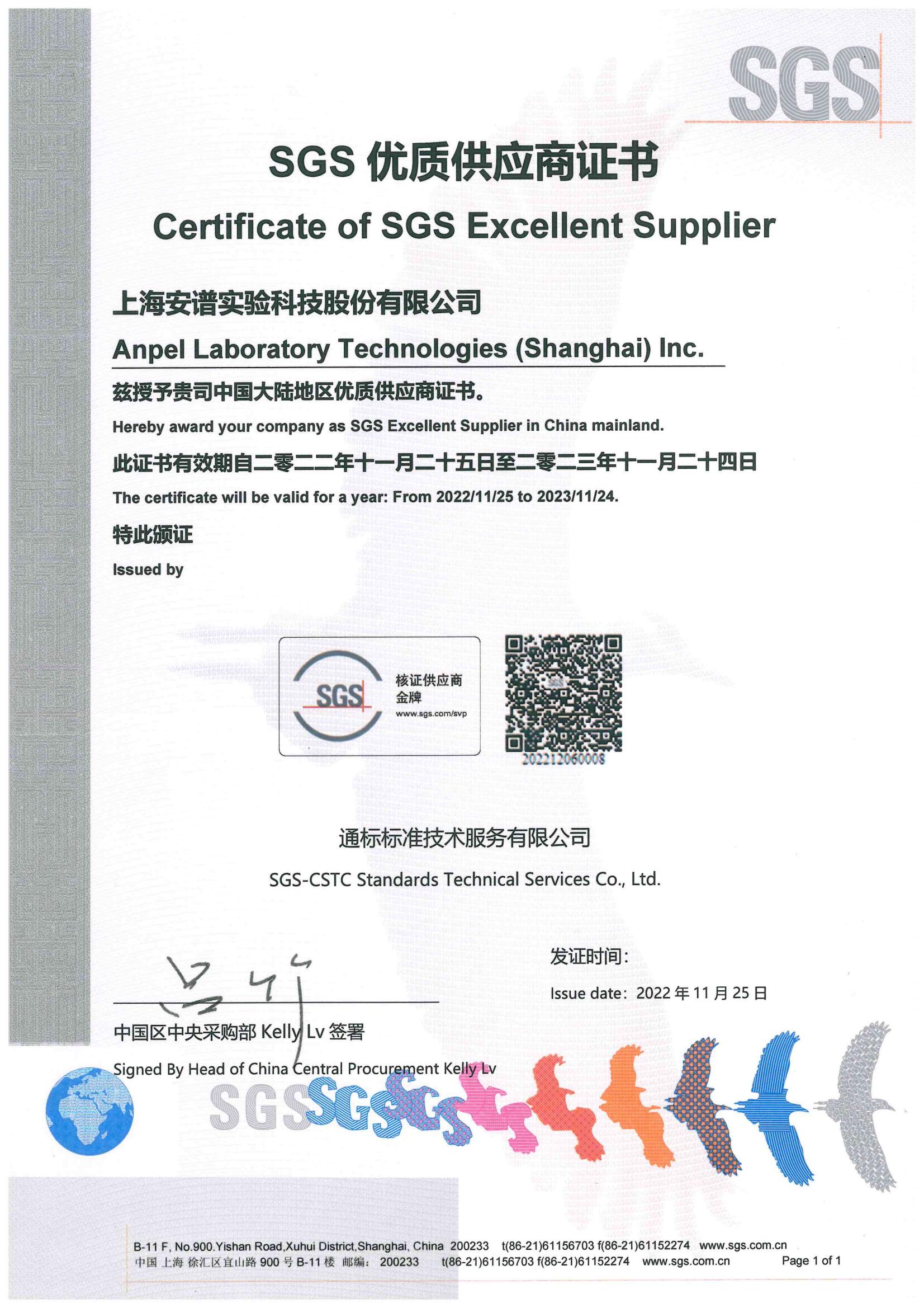 Certificate of SGS Excellent Supplier